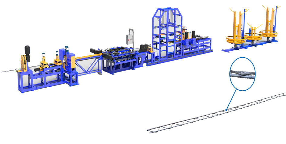 鋼筋調(diào)直機構(gòu):主筋和腹桿筋由盤料經(jīng)矯直機后矯直后焊接,自動化程度高,生產(chǎn)效率高. 焊接主機:自主研發(fā)的焊接氣缸.焊接速度快,從而提高整體焊接生產(chǎn)線的生產(chǎn)速度.